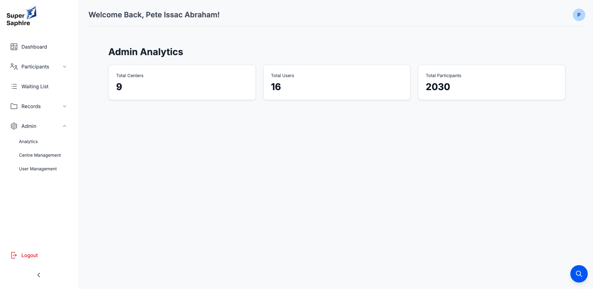 Admin Analytics gives network leadership a single-screen view of the entire operation: total centres, total staff users, and all-time participant count. The numbers that previously required phone calls across multiple centres now load in under a second.