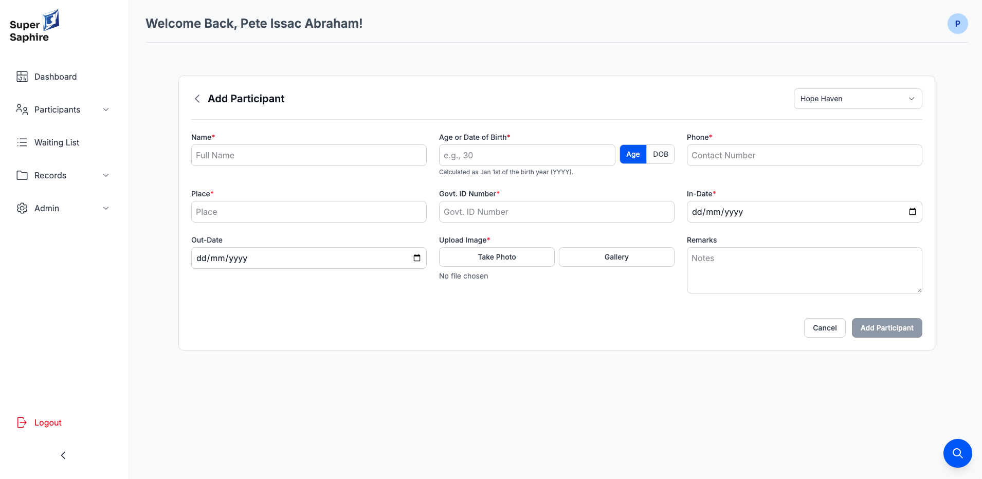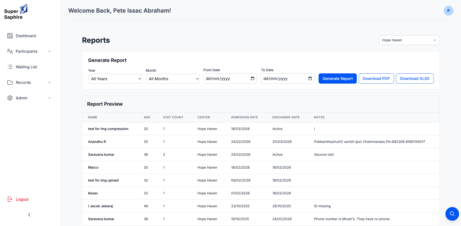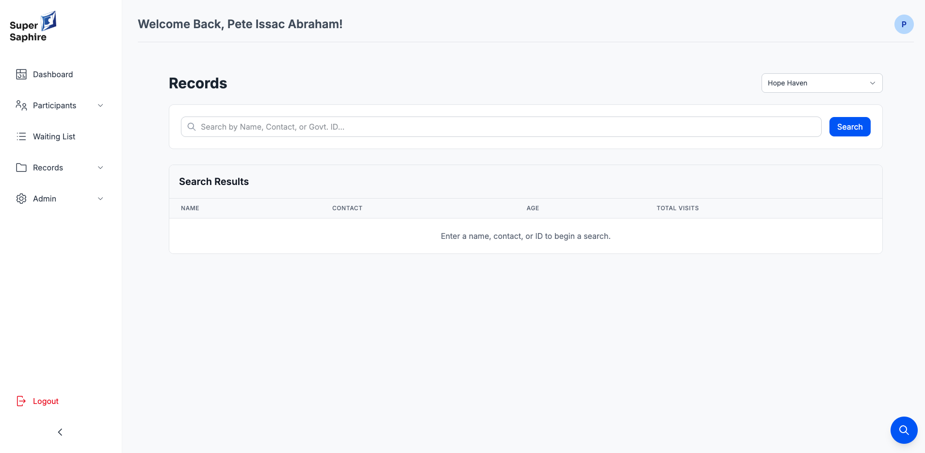 Super Saphire was commissioned to replace that fragmented system with a single, role-aware platform that tracks every participant from admission through discharge — and across repeat visits — in real time.